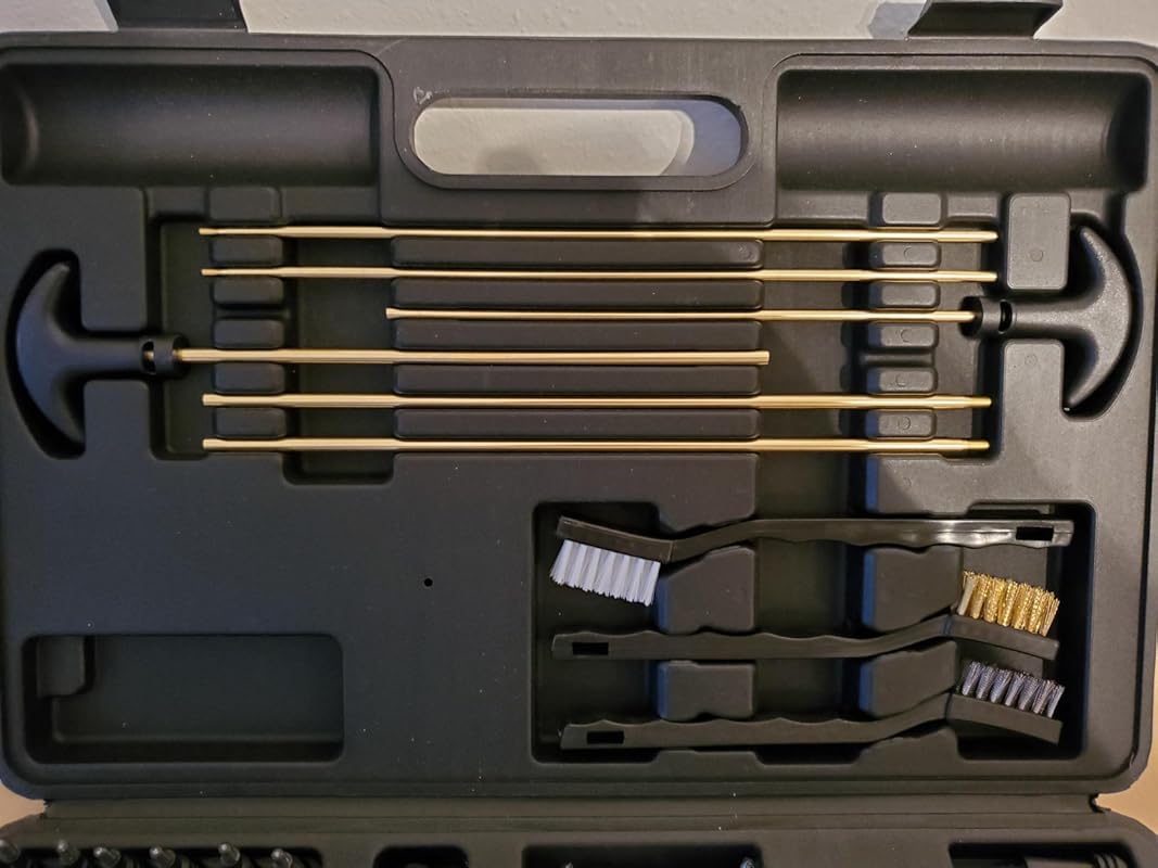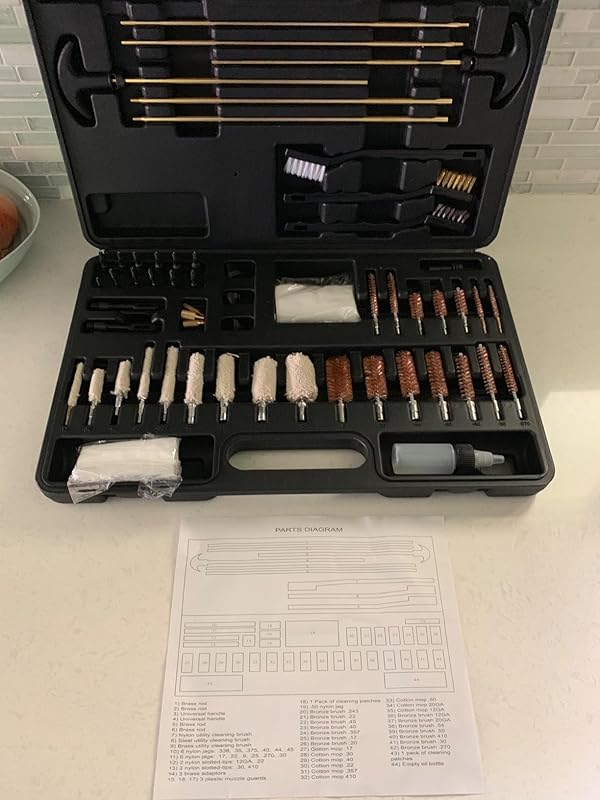 This cleaning kit has everything you need for pretty much any caliber. The brushes and mops hold up well as the attachments are made out of medal. The scrubbing brushes work well and don’t scratch any surfaces. There are two sets of rods of different diameters that you can fit the different sizes of jags on and use them to push the cleaning rags through the bore. Having the small oil bottle comes in handy, making this kit a complete cleaning kit. When I’m cleaning my guns, I just have to grab this kit and I’m ready to go. I don’t need to fondle around my old cleaning box to find all the tools that I need. Everything is properly labelled in this cleaning kit. The items are the same quality as if you were to buy them in a brick-and-mortar store. I can’t tell the difference. The carrying case is sturdy and snaps closed. I really like this kit and it will definitely become a staple in cleaning my guns. I highly recommend picking this up and save yourself the hassle of hunting down a certain part that you need and it’s at a good price!